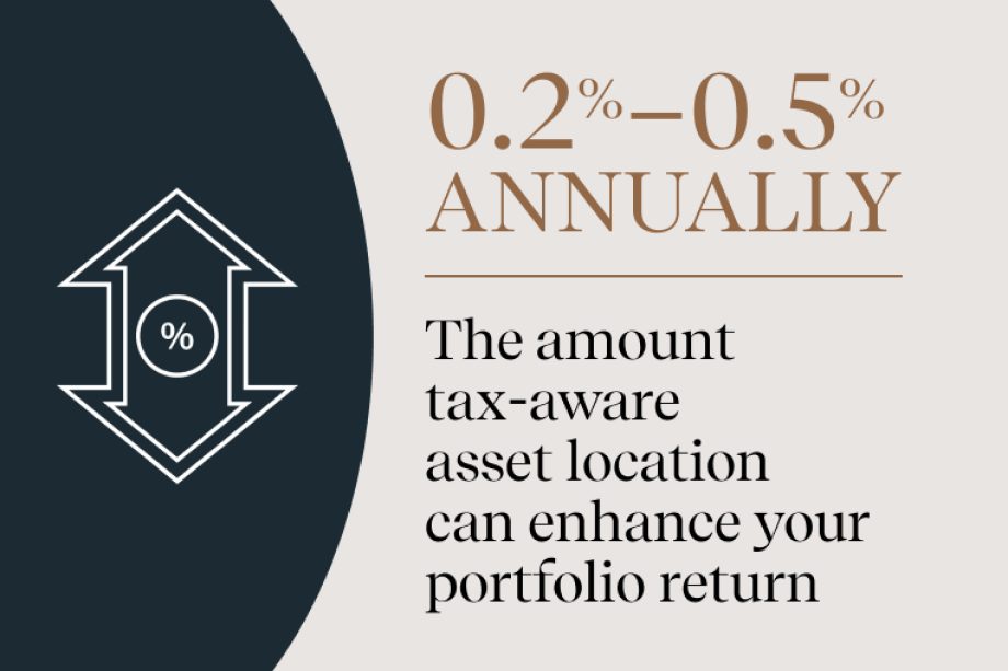 Asset location involves strategically placing investments in the optimal type of account: taxable, tax-deferred or tax-free. When properly implemented, tax-aware asset location can enhance portfolio returns by 0.2% to 0.5% annually, studies have shown.2